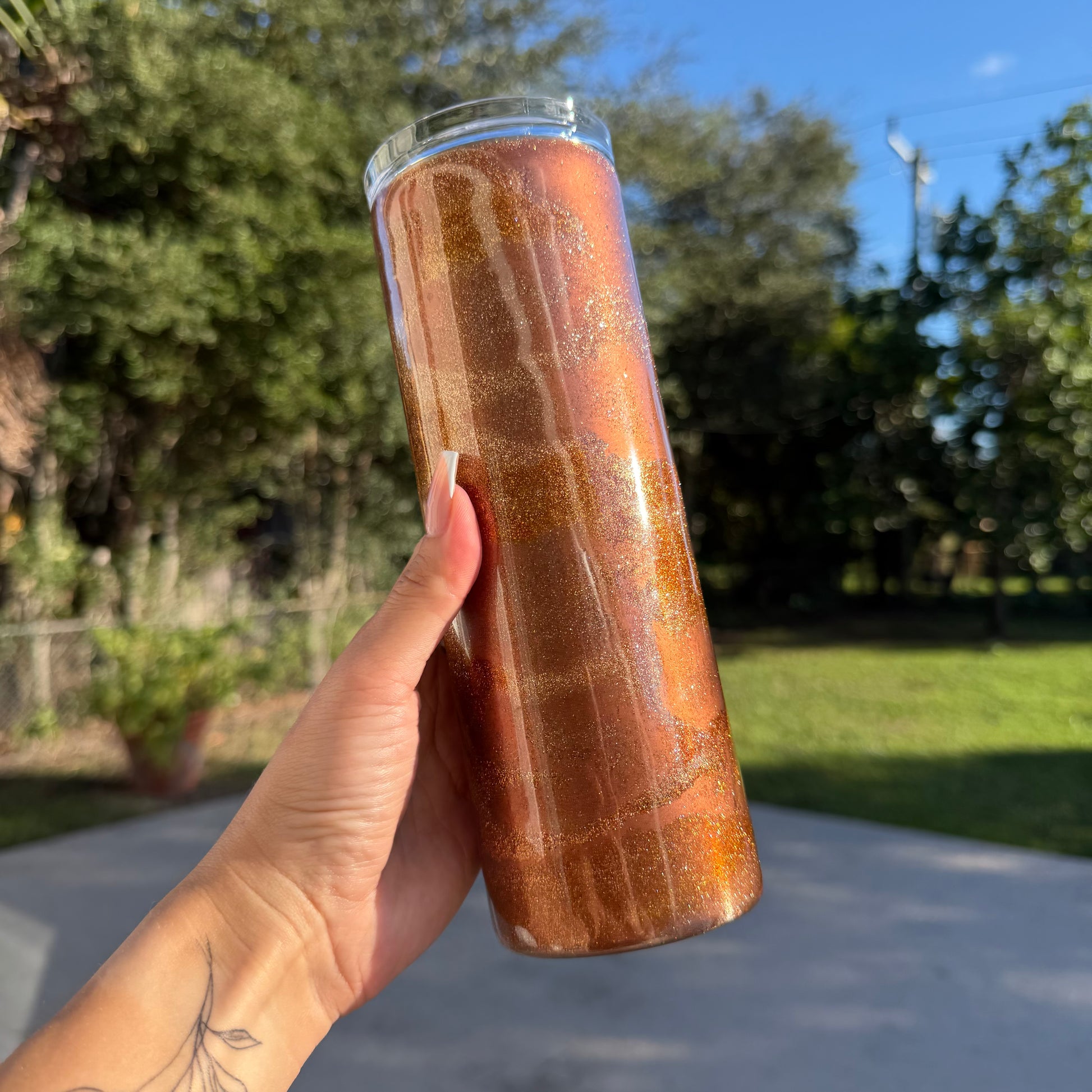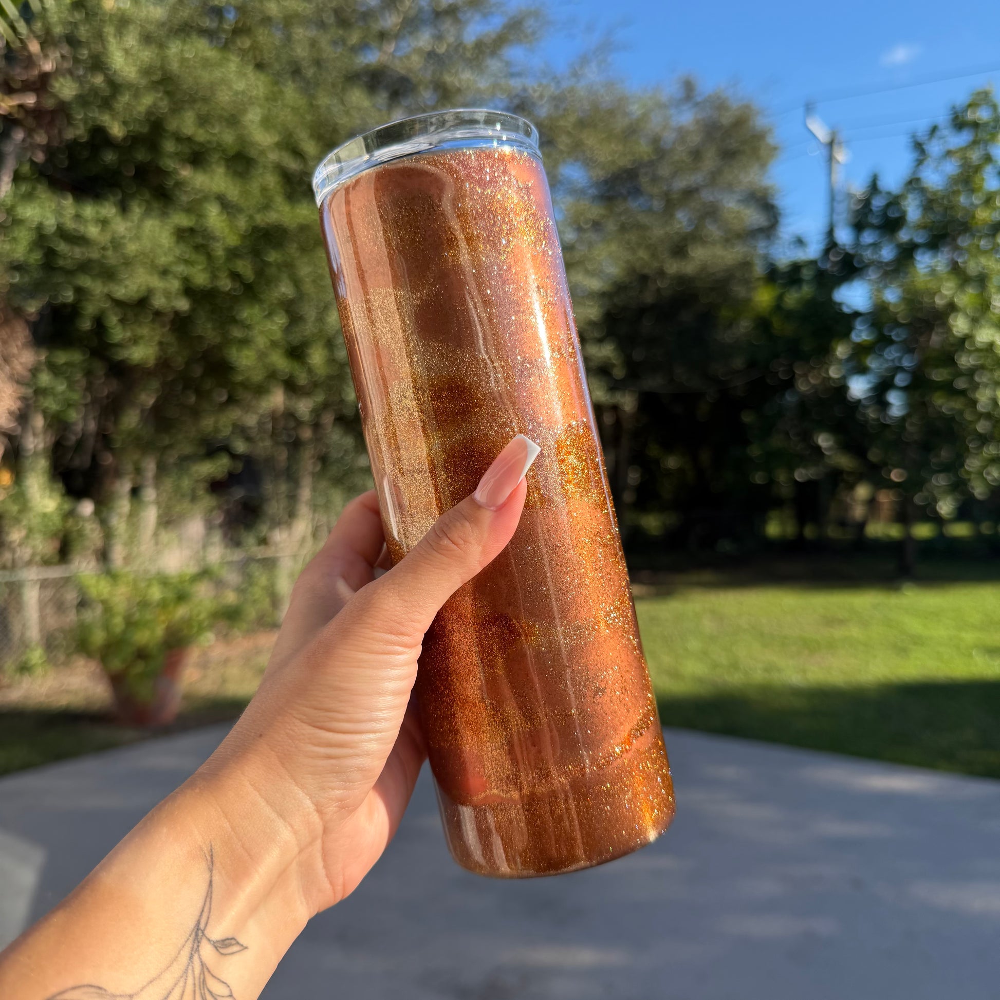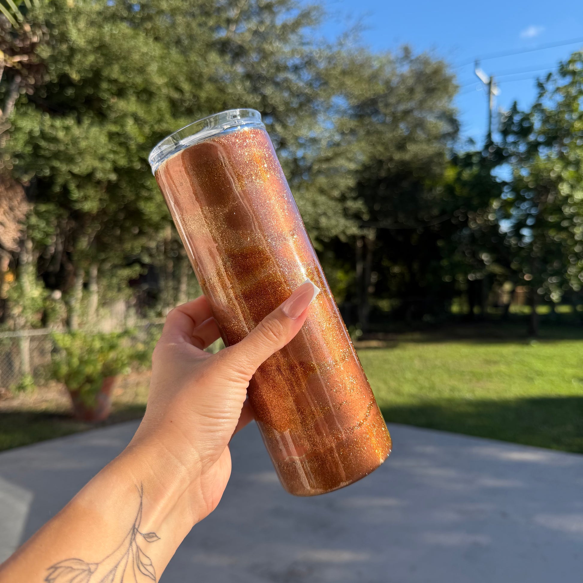 Elevate every sip with our beautifully crafted, one-of-a-kind 20 oz tumblers. Perfect for iced coffee, smoothies, seasonal cocktails, and more! Each tumbler comes with a clear sliding lid and straw for easy, spill-free sipping on the go—bringing a touch of elegance to your day.
